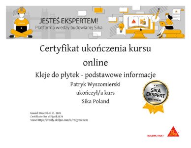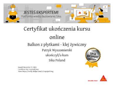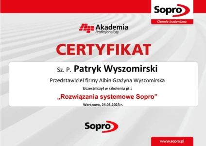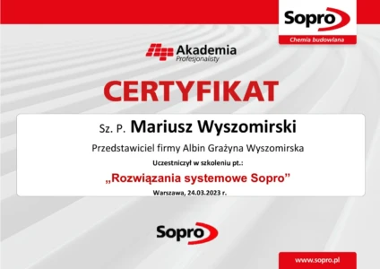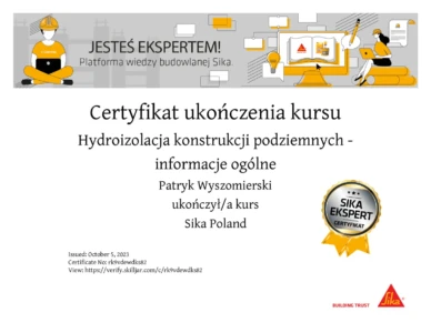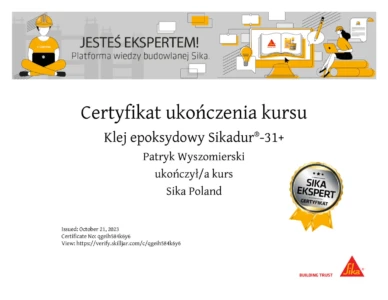 Dlatego z dumą prezentujemy nasze certyfikaty, które są potwierdzeniem najwyższej jakości świadczonych przez nas usług. Nasze uprawnienia obejmują szeroki zakres specjalizacji, od iniekcji ciśnieniowych i krystalicznych, przez kompleksowe remonty balkonów i tarasów, aż po profesjonalną odnowę klatek schodowych. Każdy certyfikat, który posiadamy, został zdobyty dzięki ciężkiej pracy, szerokiej wiedzy oraz wieloletniemu doświadczeniu naszego zespołu.